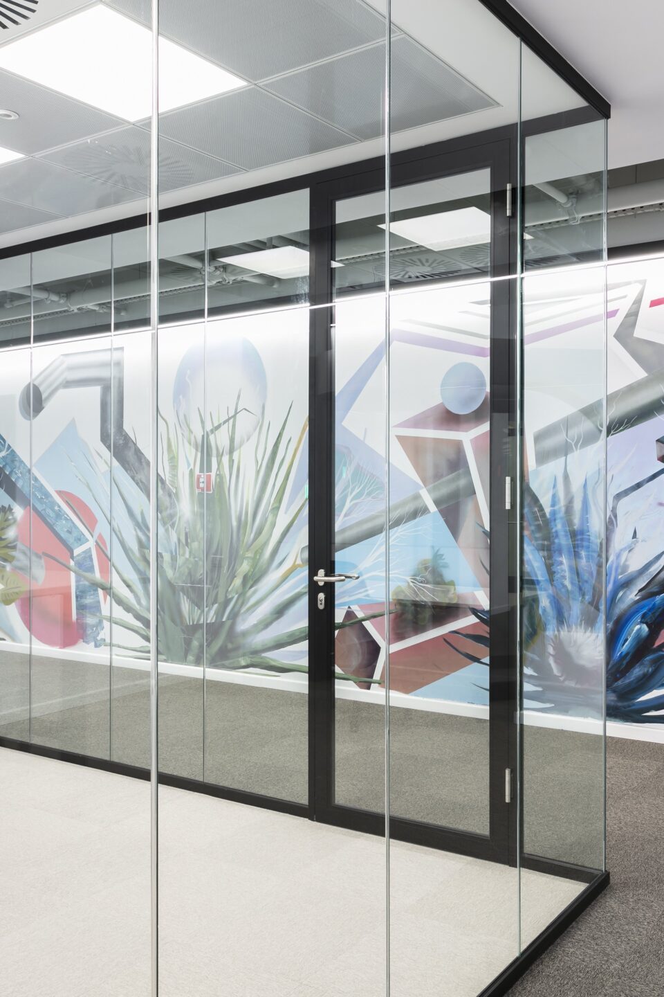 The IT services company in Bucharest implements the concept of the five spatial zones to perfection. There are teamwork areas in the central zones as well as rooms for communication and inspiration. In addition, there are rooms for concentrated work, meeting rooms and team workplaces created using our transparent glass partition walls fecoplan Rw,p= 42 dB with fecotür A40 aluminium-frame glass door elements, which are flush on the room side and achieve a sound insulation test value of Rw,p= 37 dB. The colourful design of the walls with abstract, geometrically-shaped graphics, coordinated with the subtle colours of the furniture, reflects the innovativeness and uniqueness of the company and at the same time creates points of orientation and identification.