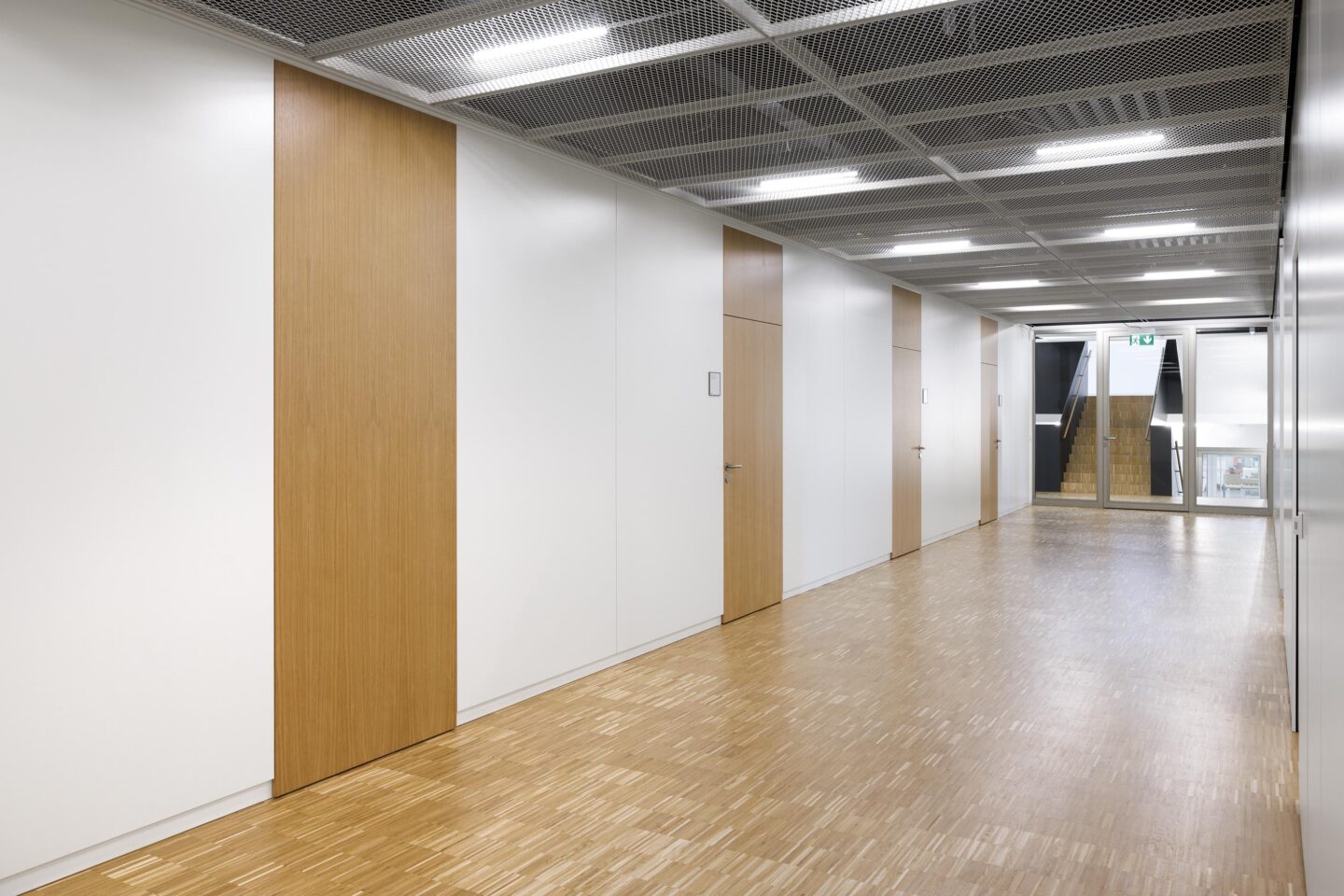 In the second construction phase, the old administration building was refurbished in accordance with the KfW 70 standard. The façade is clad in aluminium composite panels to match the new buildings. A photovoltaic system is designed to cover peak loads and almost the entire daily demand by in-house generation. The latest gas condensing technology and a comprehensive rainwater harvesting concept also contribute to the building’s efficiency. The refurbishment of the existing building also included floor to ceiling glass walls using flush fitted double glazed fecofix with Rw,P = 45 dB and fecotür H70 wooden door elements with Rw,P = 37 dB and H85 with 42 dB. The frames are covered on the corridor side. The surfaces of the door leaves and technical door side panels are graphite black with a velvety matt finish. The profiles are powder coated in RAL 7021 black grey. Discretion in the conference rooms can be controlled with curtains. To allow for flexible restructuring at a later date, the corridor walls were also designed as solid feco walls with oak veneered door leaves. A cafeteria opening onto the inner courtyard provides a place for staff to meet and socialise.