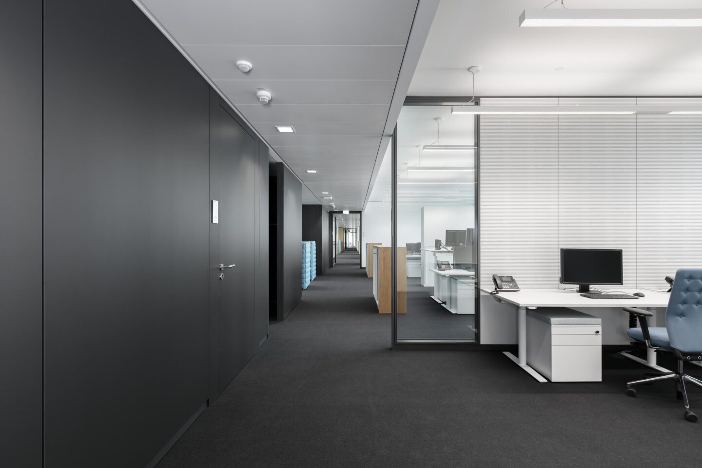 Acoustically-effective fecowand office partition walls structure the office space along the facade. The doors are white, flush-mounted wooden H70 door elements with concealed door frame. The office and meeting rooms are designed with the flush-walled double glazing fecofix transparent. Using height-adjustable standing/sitting desks from ophelis as well as office swivel chairs and communication furniture from Vitra and Walter Knoll, the workplaces appear futuristic.