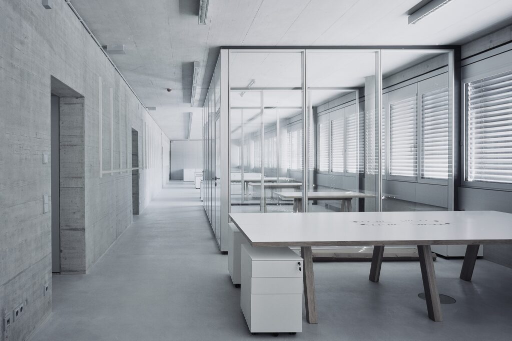 The wall and door leaf surfaces are covered with an aluminium decor surface. The hard-wearing CPL surface ensures economical building operation. The RAL 7016 anthracite powder-coated connection profiles set the system walls apart from the exposed concrete with a shadow groove. System walls with sound insulation requirements up to Rw,P = 52 dB are mounted on sleepers. Sound transmission via the screed is thus decoupled. Even higher sound insulation requirements up to Rw,P = 54 dB and the combination with acoustically perforated surfaces are achieved with a double substructure and a multi-layer wall structure. Meeting rooms are glazed room-high with fecofix double glazing flush with the wall. The all-round 20 mm slim aluminium profiles are E6/EV1 anodised. The sound insulation test value of the fecotür A70 aluminium frame glass doors flush with the wall on the corridor side is Rw,P = 37 dB.