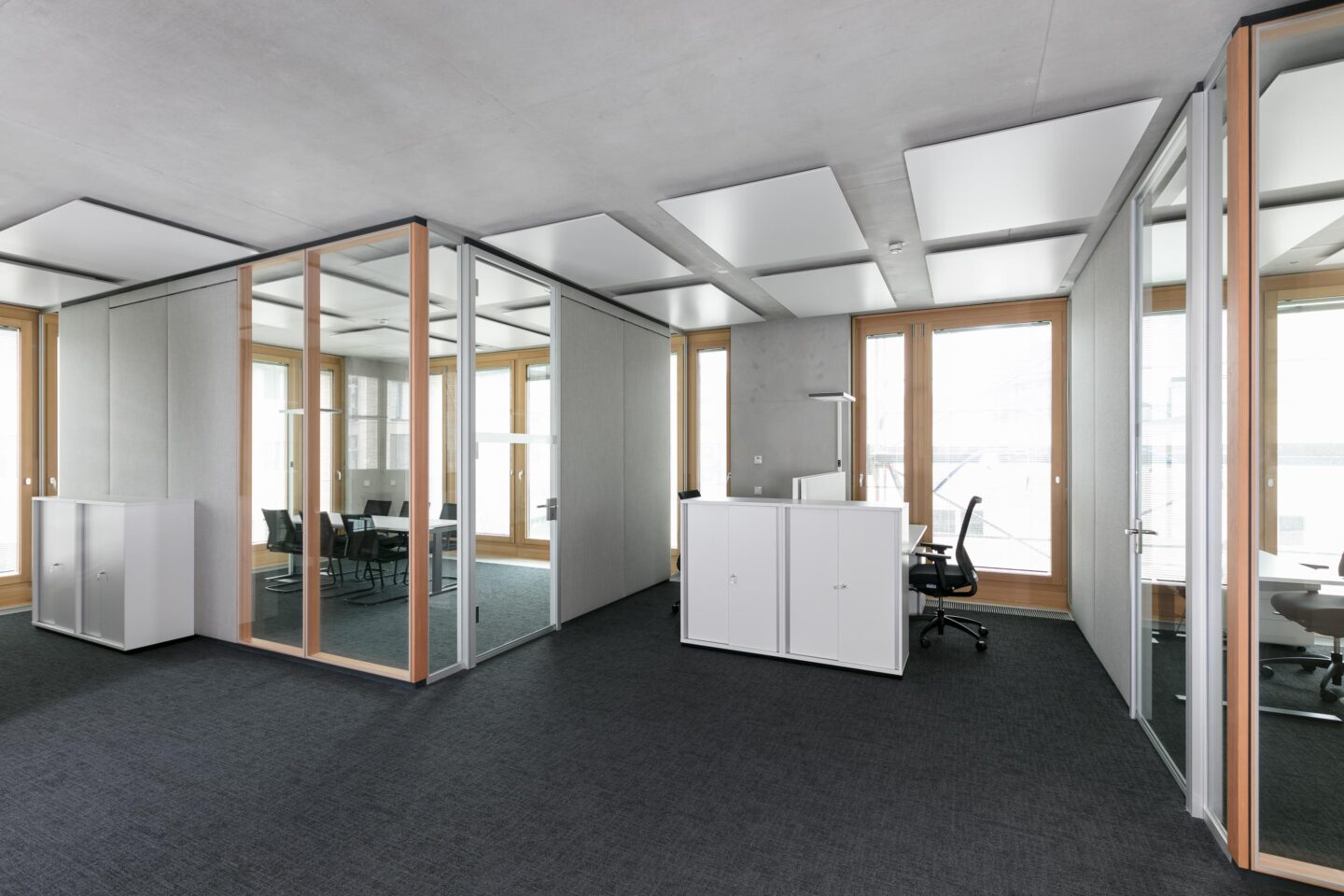 In order to achieve good room acoustics in the office floors, which are constructed with sound-reflecting concrete-core tempered exposed ceilings, feco installed 1,280 fecophon absorber panels with an object-specific fabric covering. The office space is divided into acoustically separated areas without sacrificing the open communicative basic structure. fecoair overcurrent elements are integrated into the fabric-covered walls with special slit outlets. Structural glazing constructions with wooden supporting frames create office landscapes with a natural character.