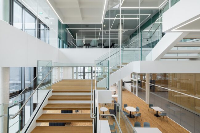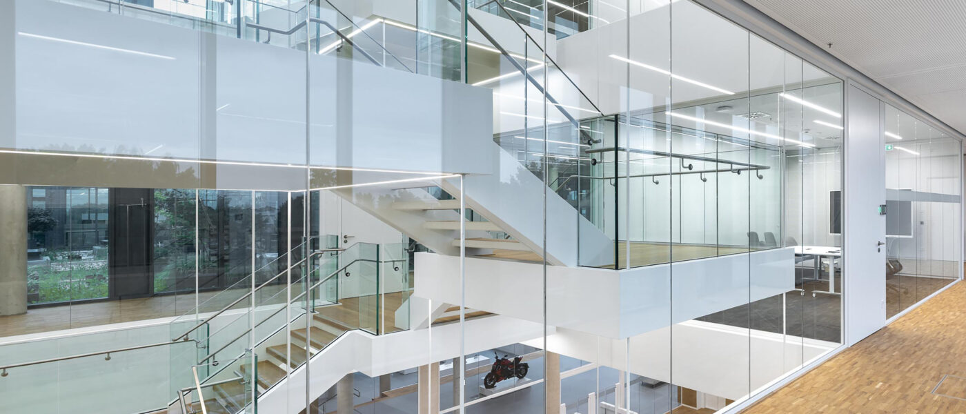 Untertitel: Nurglaskonstruktion ermöglicht transparentes Treppenhaus.