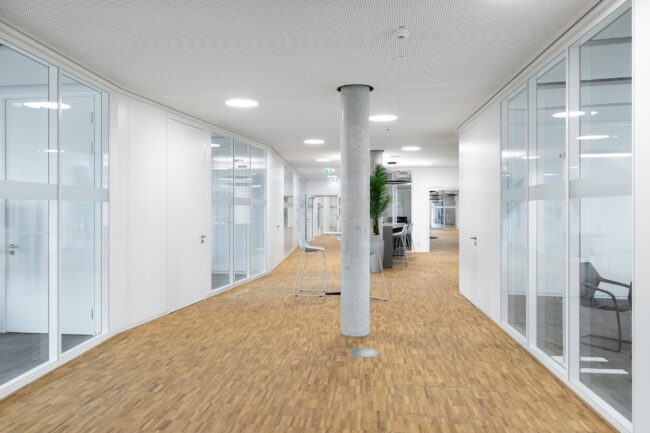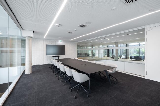 Die räumliche Struktur wurde mit feco-Systemglaswänden realisiert. Im Foyer sorgt eine 4,94 Meter hohe fecoplan-Glaswand für eine kontrollierte Zugänglichkeit ohne den großzügigen Raumeindruck zu stören. Die Nurglaskonstruktion aus 12 mm ESG mit einem Schalldämmprüfwert von Rw,P = 37 dB sowie mit 16 mm VSG-SI und Rw,P = 42 dB bietet Transparenz und gleichzeitig Schallschutz für Büros und Besprechungsräume. Im Vorstandsbereich kommen Räume mit erhöhten Anforderungen an den Schallschutz zum Einsatz. Hier sorgt die wandbündige Doppelverglasung fecofix mit einem Schalldämmprüfwert von Rw,P = 47 dB für akustische Diskretion. Vollwände vom Typ fecowand mit schallabsorbierenden Oberflächen verbessern die Raumakustik zusätzlich. Die von feco gefertigten Holz-Türelemente fecotür H70 sind zum Teil raumseitig mit akustisch wirksamen Schlitzungen ausgestattet. Die mit Eiche-Echtholzfurnier belegten, emissionsarmen Holzträgerplatten der fecophon-Wandschalen mit vertikaler Schlitzung 14/2 mm prägen die mehrgeschossige Empfangshalle auch als Vorwandverkleidung. Die in bildhafter Abwicklung gefertigten Wandverkleidungen erreichen eine Höhe von bis zu 6,84 Metern. Integrierte Garderoben mit Schiebetüren und Lockerschränke vervollständigen das Konzept.
