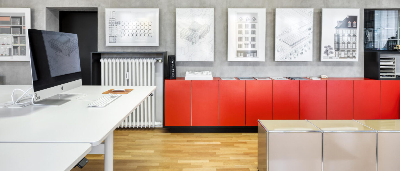 Die Architekten arbeiten in einem ehemaligen Ladengeschäft mit großzügigen Schaufenstern zur Straße. Im hinteren Bereich trennt eine gebogene fecoplan-Nurglaswand den Arbeitsplatz des Bürogründers akustisch vom Besprechungsraum ab. Ergänzt wird die Zonierung durch fecowand-Vollwände mit integrierten fecoorga-Profilen. An diesen können Regalböden, Haken und pinnbare Filzelemente flexibel eingehängt werden.