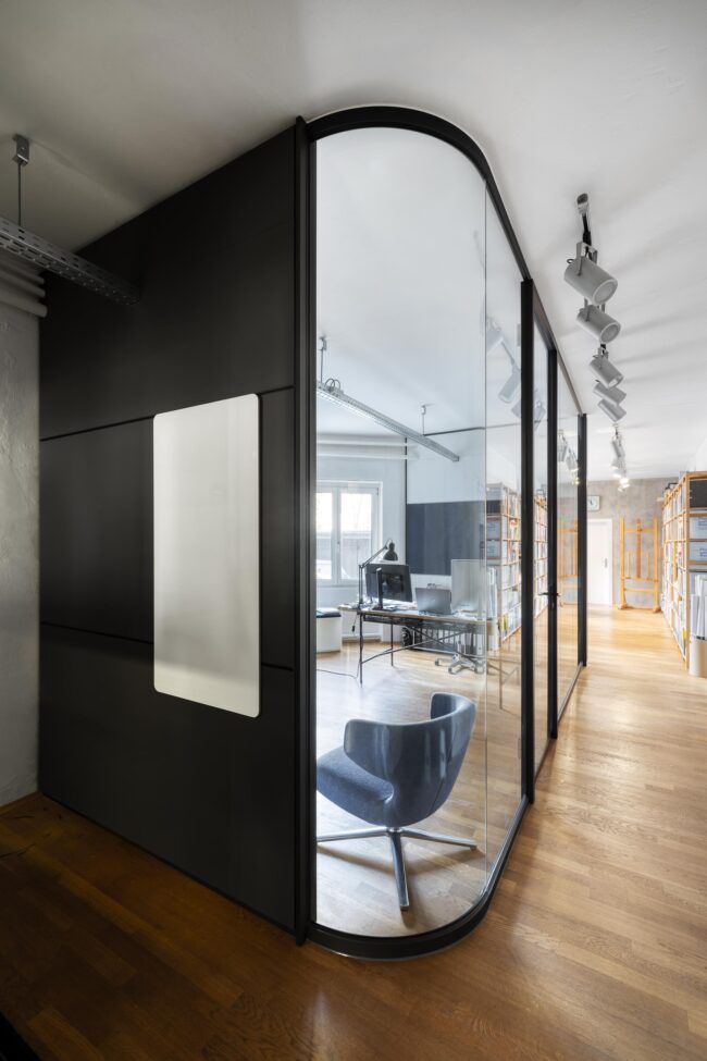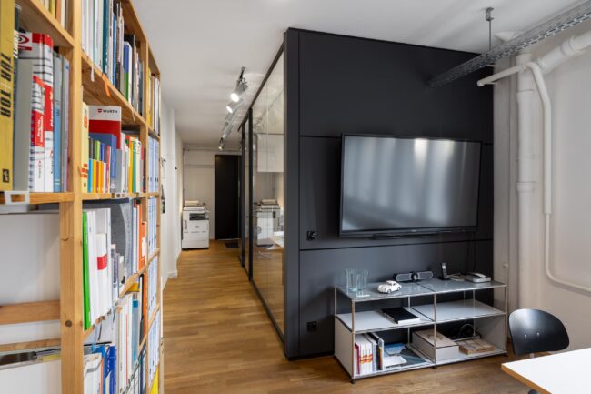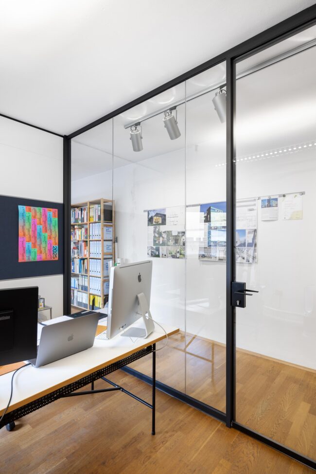 Materialität und Farbe sind gezielt eingesetzt: Weiße Flächen reflektieren das Tageslicht, während tiefes Graphitschwarz mit samtmatten Oberflächen Akzente setzt. Profile und Zargen sind in RAL 7021 Schwarzgrau, Türbeschläge und der FSB-Drücker in RAL 9005 Tiefschwarz ausgeführt. Die sorgfältige Integration der vorhandenen Heizrohre und Kabeltrassen zeigen die Präzision in Planung und Umsetzung. Mit dieser Lösung schafft m_architekten nicht nur ein inspirierendes Arbeitsumfeld, sondern auch ein deutliches Zeichen: für zukunftsorientiertes Planen, gutes Design und dafür, wie Räume Haltung zeigen können.