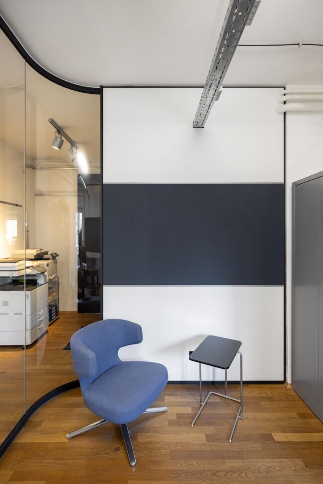 Untertitel: Die geschwungene Glaswand schafft Rückzug und akustische Abschirmung.