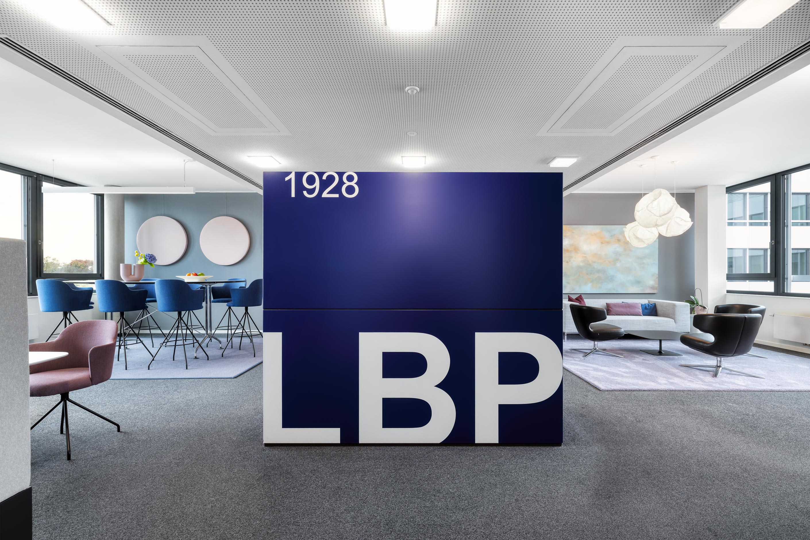 Seit vielen Jahren begleitet feco die Patentrechtskanzlei in ihrer räumlichen Entwicklung. Ein prägendes Gestaltungselement aus der Planung 2017 – die markante blaue Technik-Insel – wurde bewusst beibehalten und neu in Szene gesetzt. Sie bildet nun das Herzstück einer offenen Loungezone, die durch Farbtöne in Blau, Lila und Rosé elegant zusammengehalten wird. Die hochwertige Einrichtung – darunter die Brunner Banc-Besprechungskoje, ein komfortables Sofa, Sessel sowie ein Stehtisch – wurden im Konzept neu arrangiert. Ergänzt um neue Möbel aus der Aleta-Serie von Viccarbe und durchdachte Accessoires, entsteht eine Atmosphäre, die an einen stilvollen Club erinnert. Farblich abgestimmte Teppiche zonieren die Bereiche subtil, schaffen Orientierung und visuelle Ruhe.