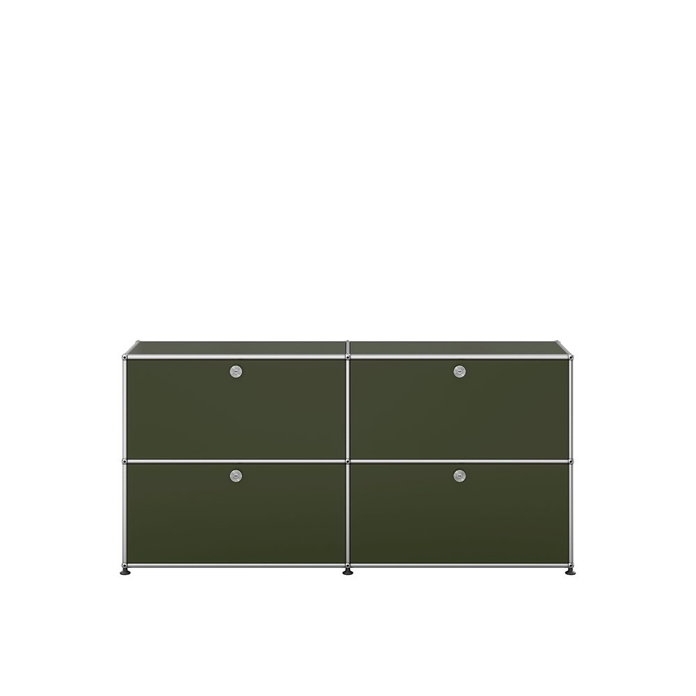 Das USM Haller Sideboard mit vier Klapptüren ist in Aktionsfarbe Olivgrün (RAL 6003) erhältlich. Die Grundlegende Struktur jeden Möbelstücks des Haller Möbelbausystems besteht aus verchromten Kugeln und Rohren aus Stahl. Die Oberfläche der des Sideboards besteht aus pulverbeschichtetem Stahl. Das verarbeitete Material entspricht höchsten Qualitätsstandards.
