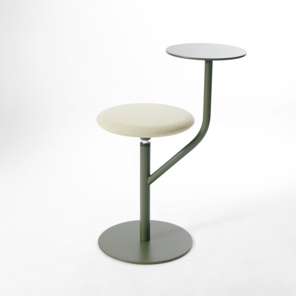 Aus dem schlanken Metallschaft entwickeln sich Sitz und Tisch in einer einzigen dynamischen Bewegung. Der gepolsterte Sitz mit Bezug Jet 9701 sorgt für angenehmen Komfort, während die schwenkbare Tischplatte zusätzlichen Nutzen bietet – ideal für Laptop, Getränk oder Notizen. Trotz der klaren Geometrie wirkt Aaron einladend und komfortabel.