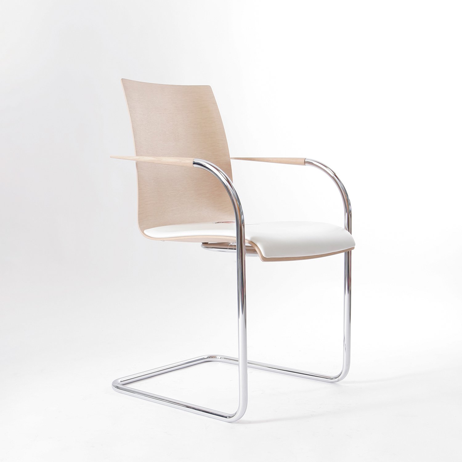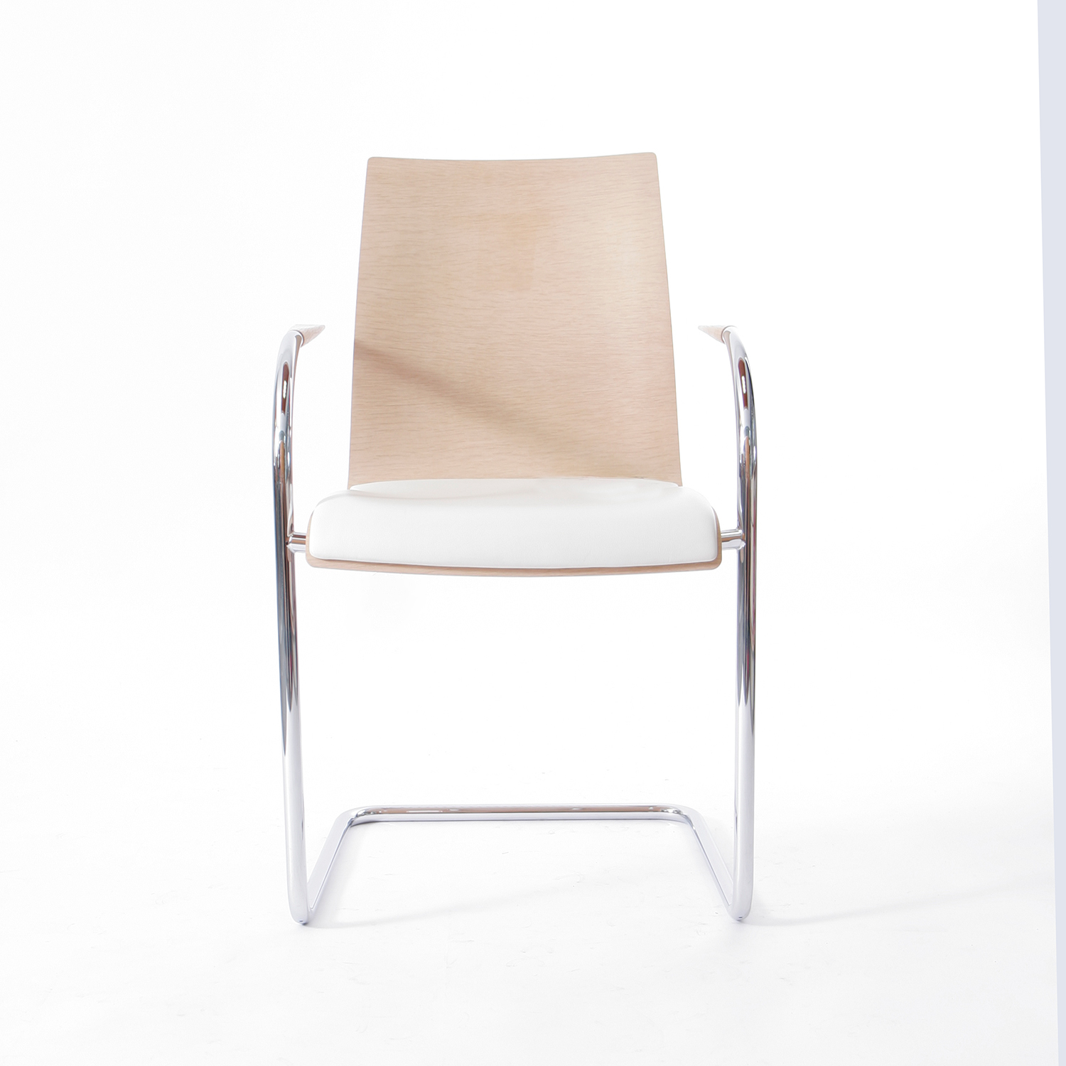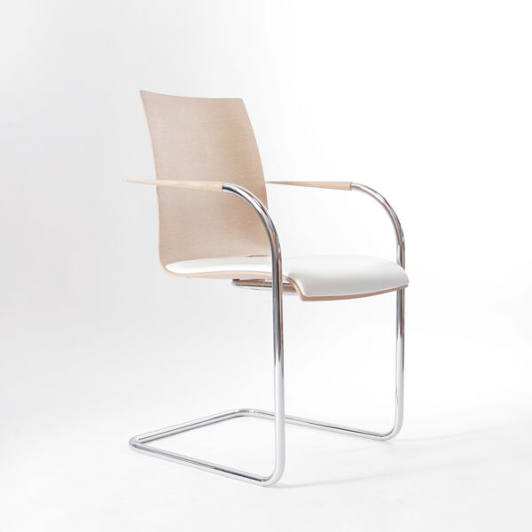 Der Freischwinger lebt von seiner klaren Linienführung und der reduzierten Formensprache. Das hell gebeizte, querfurnierte Eichenholz unterstreicht die natürliche Ästhetik, während das hochwertige Lederpolster angenehmen Sitzkomfort bietet. Das elastische Stahlrohrgestell sorgt für das typische, leicht federnde Sitzgefühl eines Freischwingers.