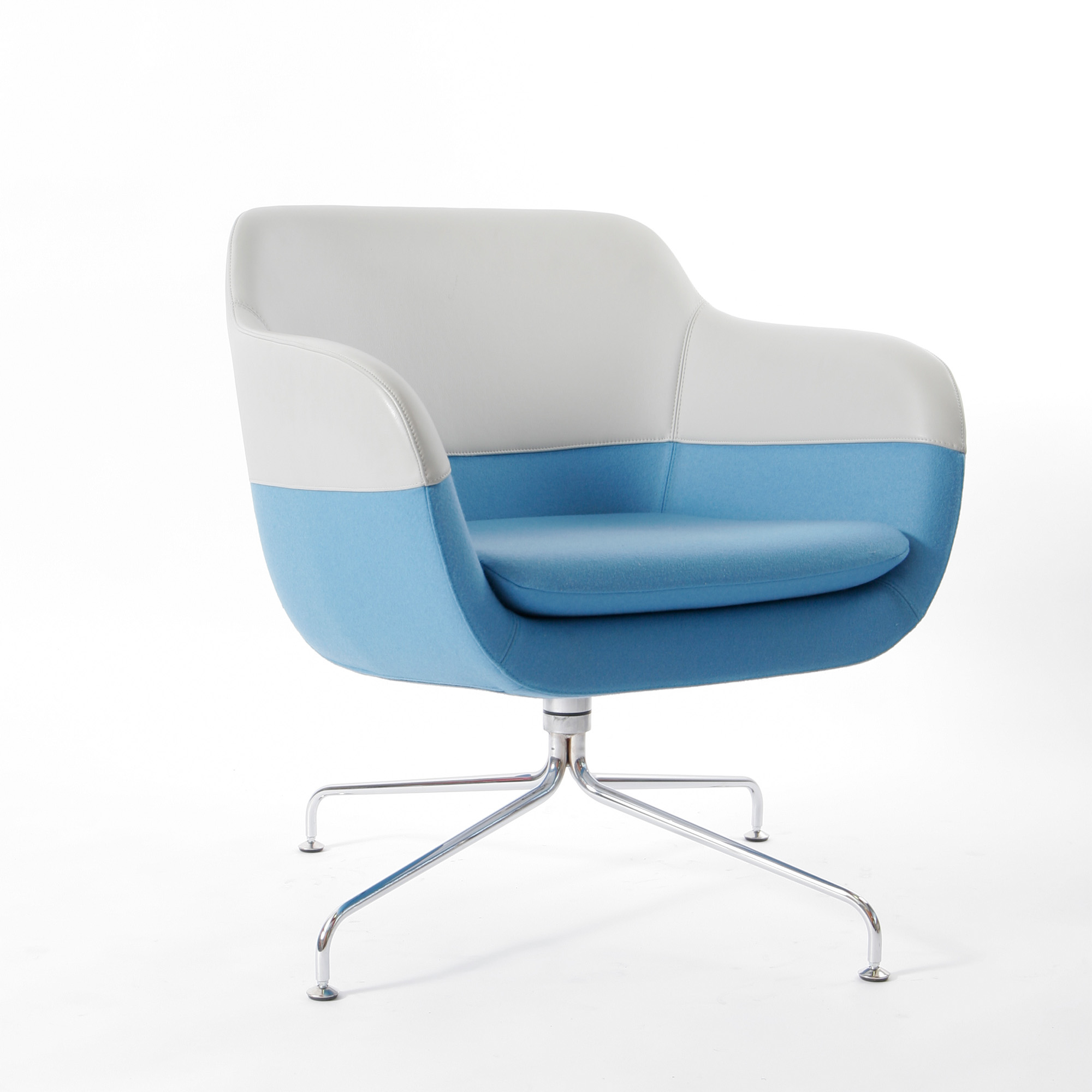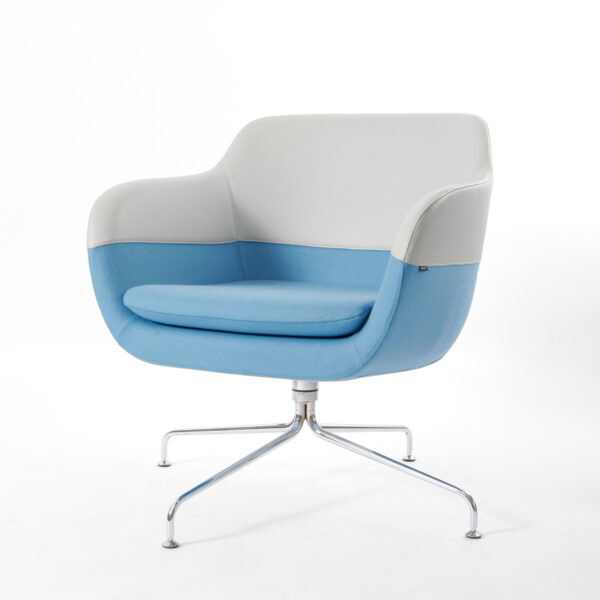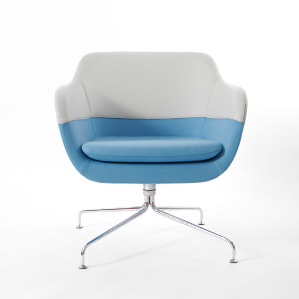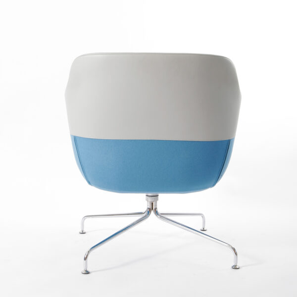 Die klare Formgebung der Schale wird durch die horizontale Teilungsnaht optisch strukturiert. Der zentral platzierte Fuß mit vier verchromten Auslegern sorgt für Stabilität und ermöglicht gleichzeitig eine angenehme Drehfunktion – ideal für flexible Lounge-Settings.