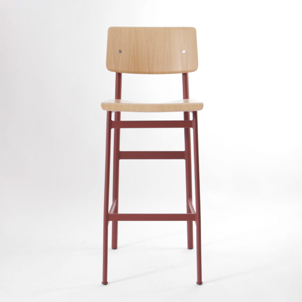 Dank der Kombination aus pulverbeschichtetem Stahl und wasserbasiert lackiertem Eichenfurnier ist der Hocker pflegeleicht und langlebig. Seine hochwertigen Materialien und das präzise verarbeitete Gestell machen ihn zur idealen Wahl für moderne Wohnräume oder stilvolle Gastrobereiche.